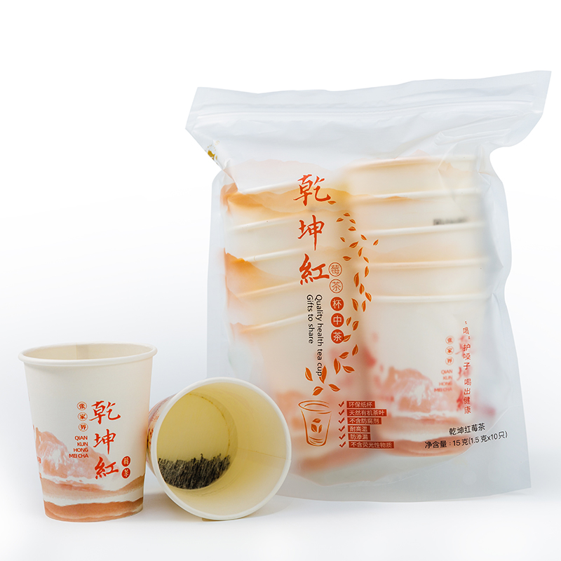 精选颗粒莓茶,加厚双层纸杯,杯底自带莓茶,一次一杯,干净卫生,商务待客必备